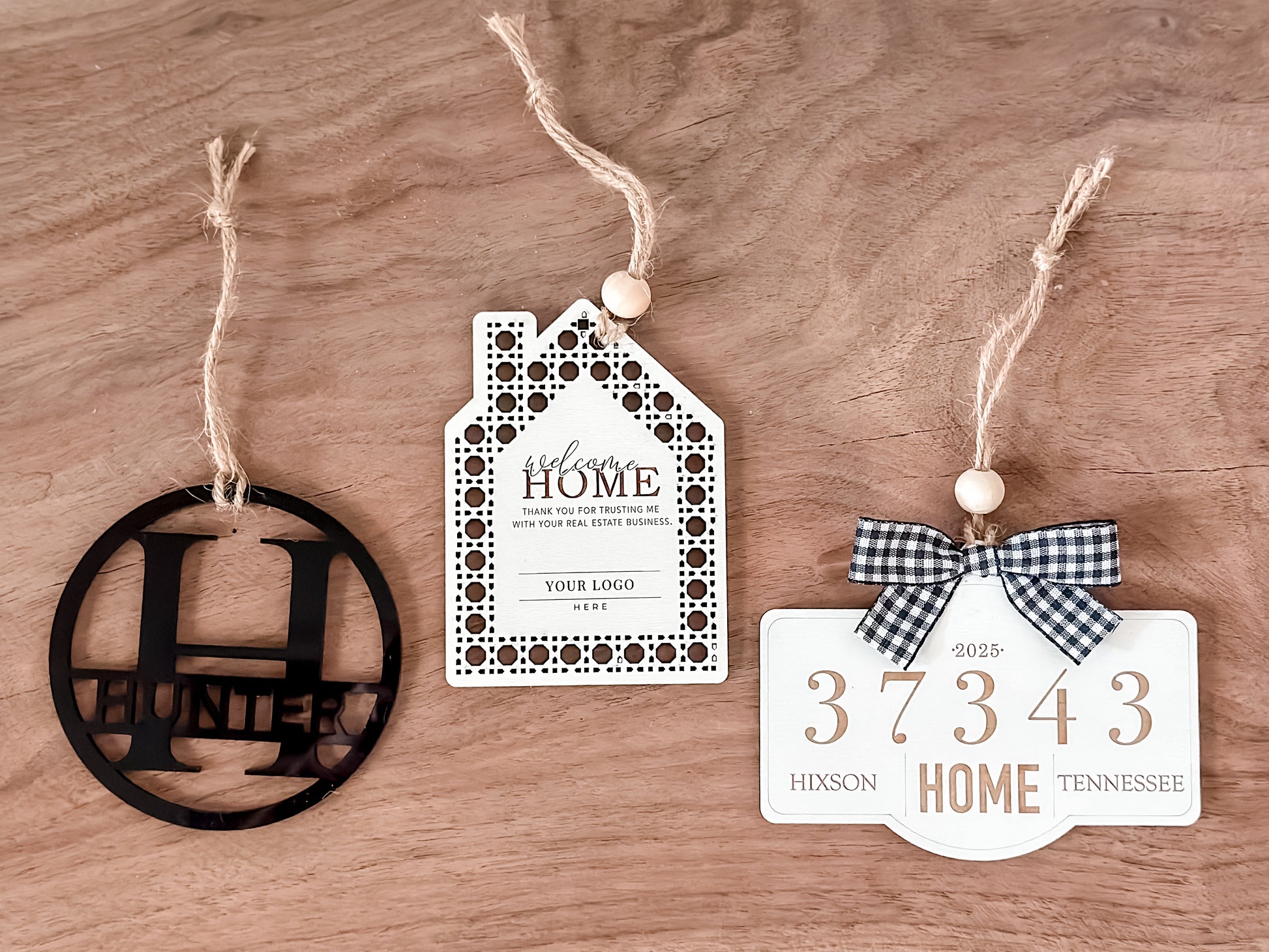 - Ribbon, Care Card, and Custom Gift Tag (Choose from white house tag, black initial tag, or zip code ornament)