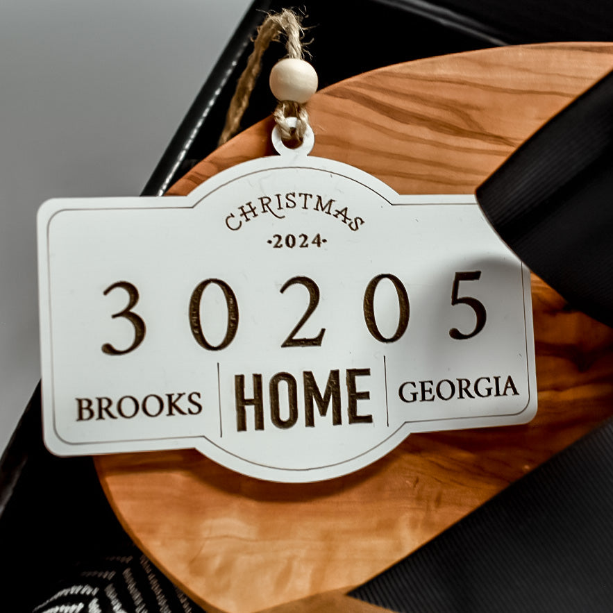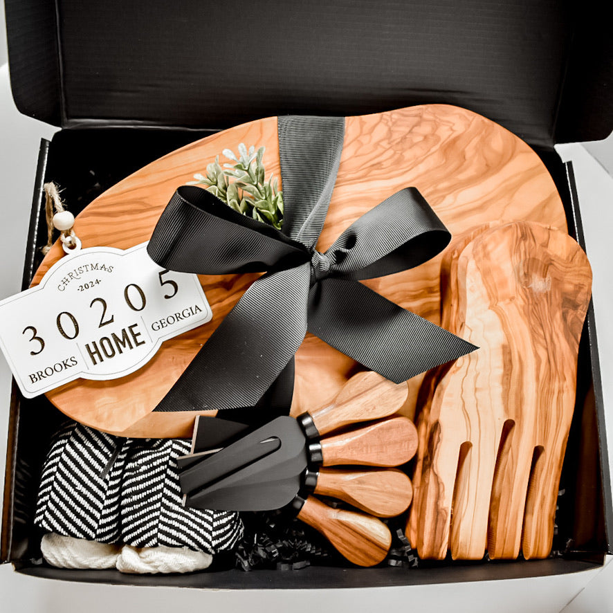 - Ribbon, Greenery, Care Card, and Custom Gift Tag (Choose from white house tag, black initial tag, or zip code ornament)